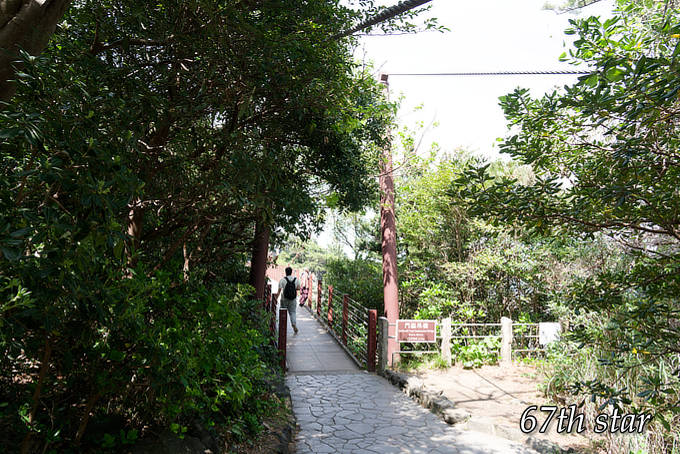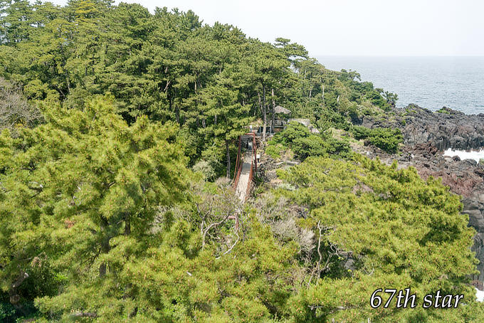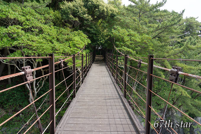 門脇埼灯台から「門脇つり橋」を撮ってみた。木が生い茂ってて全体が見えない。