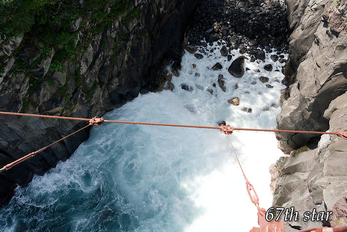 つり橋から見下ろすと入り江に押し寄せる波がすごい!